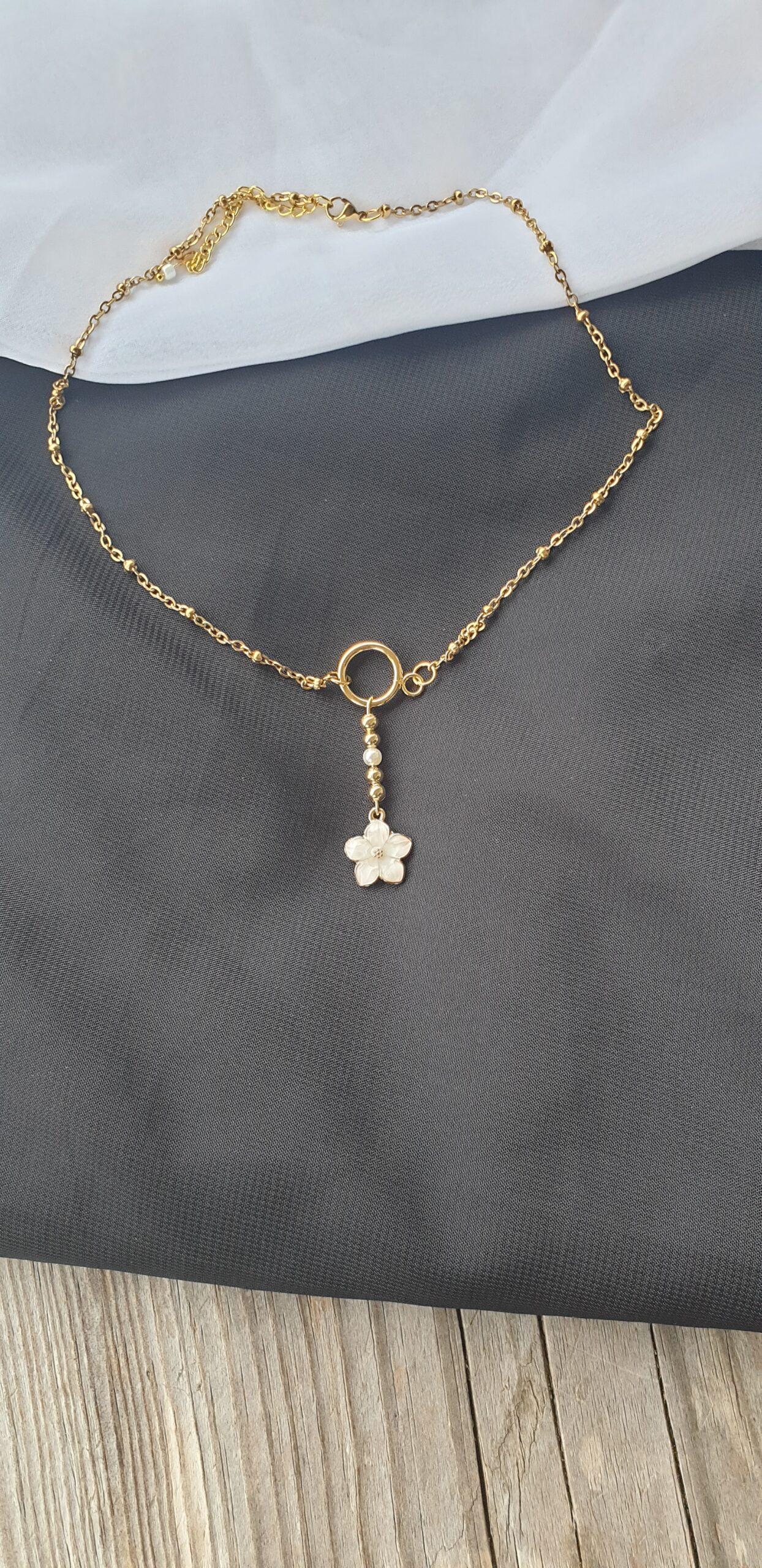 Collier Lola chaîne fine en acier inoxydable ornée de boules dorées, pendentif fleur nacrée.
